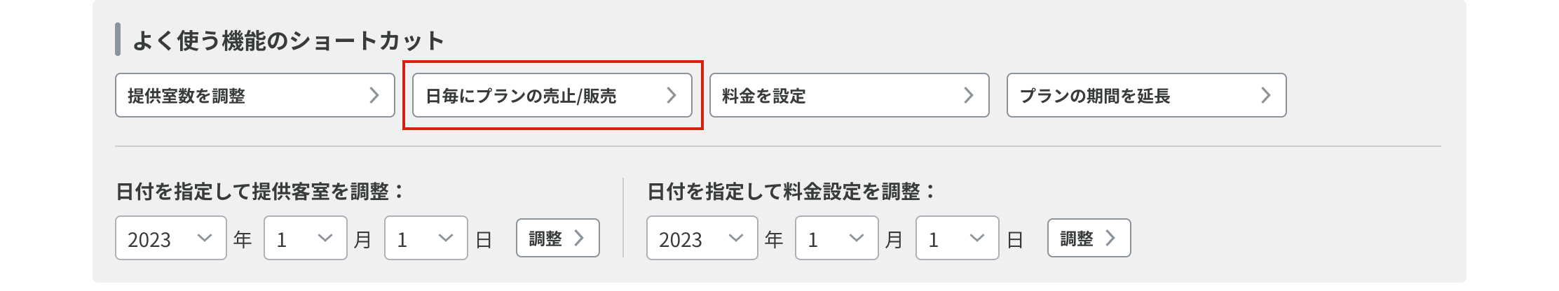 管理画面TOPの「よく使う機能のショートカット」欄で[日毎にプランの売止/販売]ボタンをクリックします。