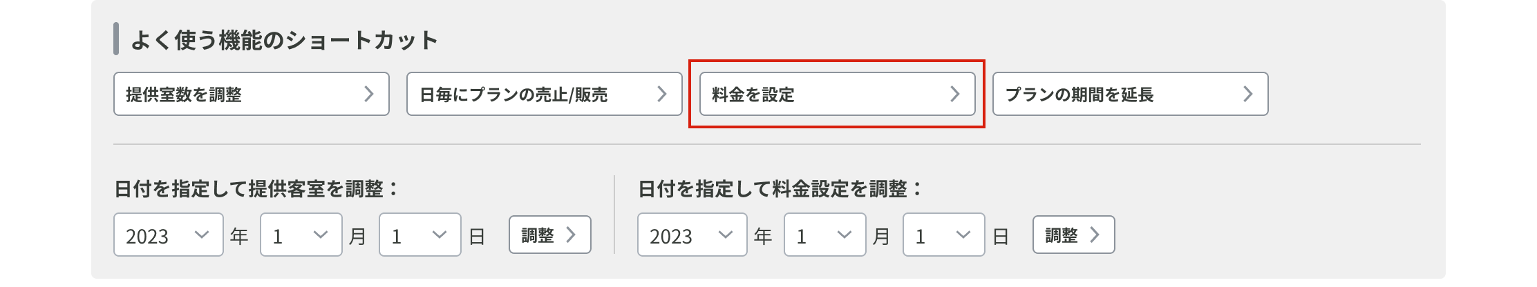 管理画面TOPの「よく使う機能のショートカット」欄で[料金を設定]ボタンをクリックします。